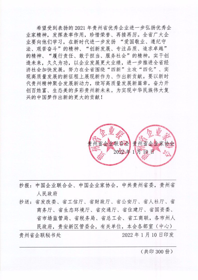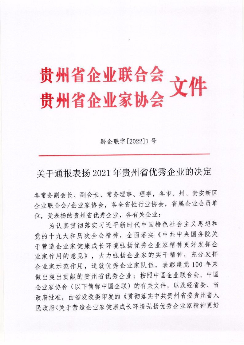 2022年1月10日,貴州省企業(yè)聯(lián)合會(huì)、貴州省企業(yè)家協(xié)會(huì)印發(fā)《關(guān)于通報(bào)表?yè)P(yáng)2021年貴州省優(yōu)秀企業(yè)的決定》,集團(tuán)公司被授予“貴州省優(yōu)秀企業(yè)”榮譽(yù)稱(chēng)號(hào)。