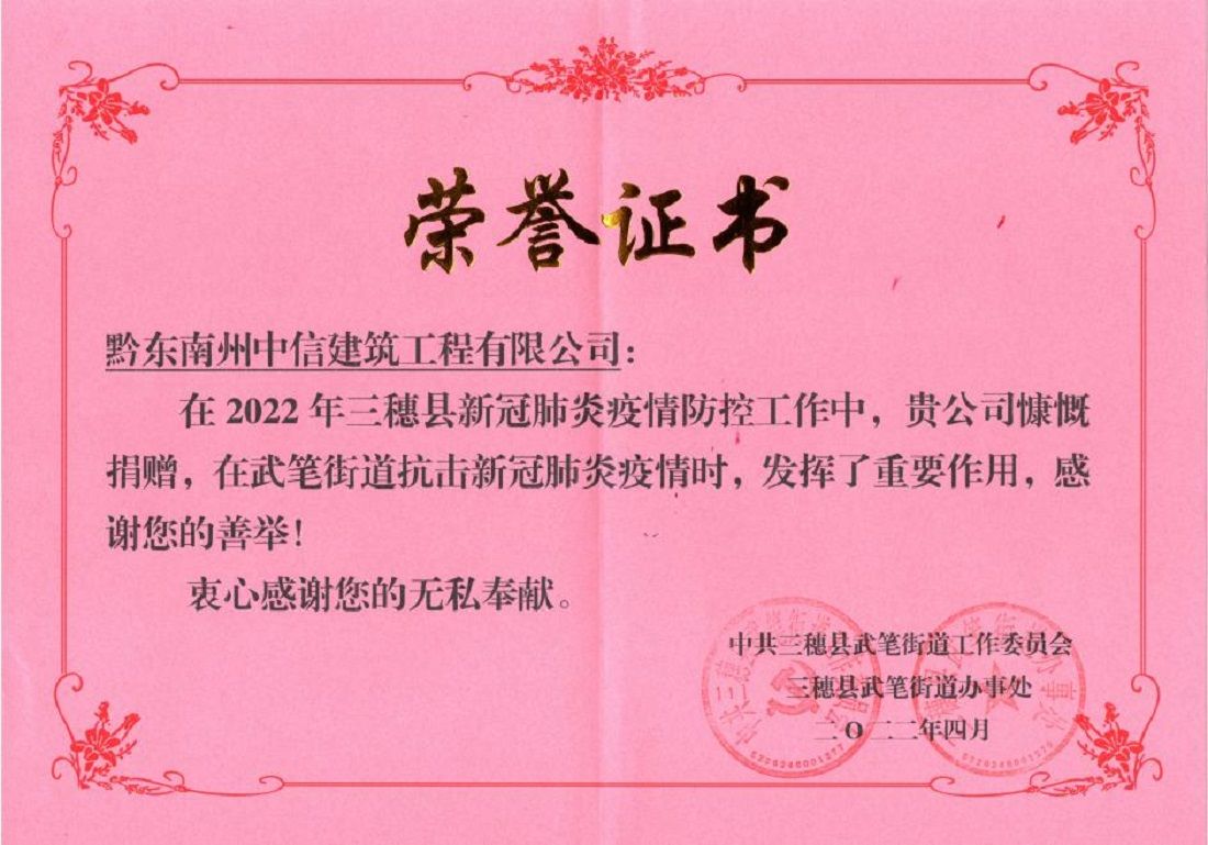 “在2022年三穗縣新冠肺炎疫情防控工作中,貴公司慷慨捐贈,在武筆街道抗擊新冠肺炎疫情時,發(fā)揮了重要作用,感謝您的善舉!”,這是三穗縣武筆街道給中信公司送來的榮譽(yù)。