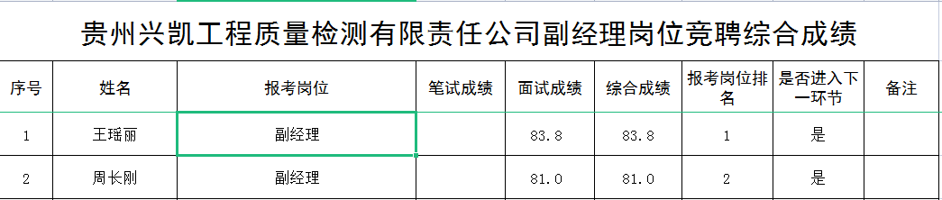 根據(jù)《貴州興凱工程質(zhì)量檢測有限責(zé)任公司副經(jīng)理崗位競聘實施方案》規(guī)定,經(jīng)報名、資格審查、面試等程序,現(xiàn)將綜合成績予以公示。