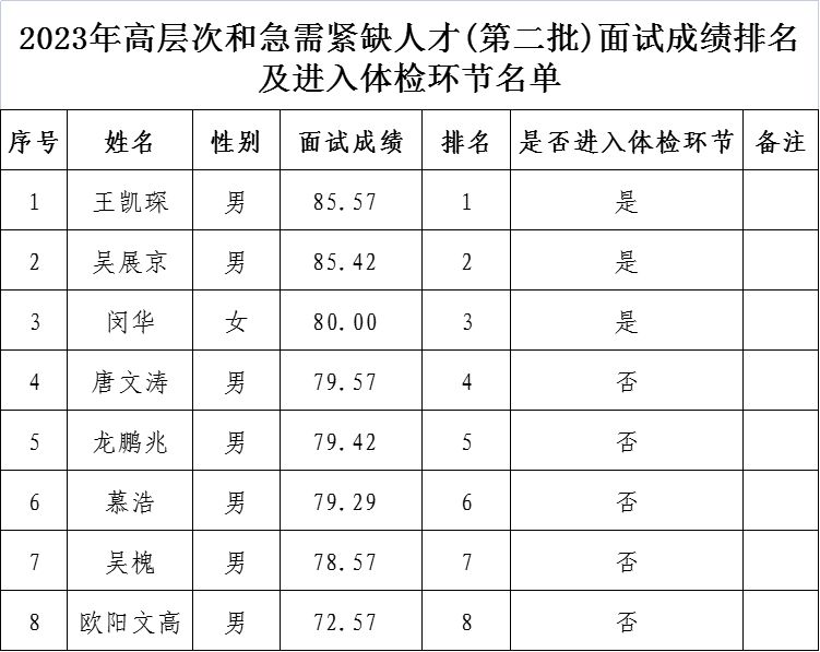 附件:2023年高層次和急需緊缺人才(第二批)面試成績排名及進入體檢環(huán)節(jié)名單