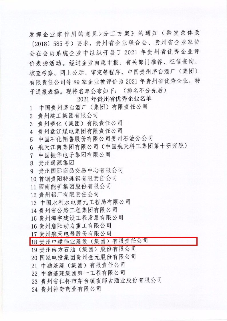 2022年1月10日,貴州省企業(yè)聯(lián)合會(huì)、貴州省企業(yè)家協(xié)會(huì)印發(fā)《關(guān)于通報(bào)表?yè)P(yáng)2021年貴州省優(yōu)秀企業(yè)的決定》,集團(tuán)公司被授予“貴州省優(yōu)秀企業(yè)”榮譽(yù)稱(chēng)號(hào)。